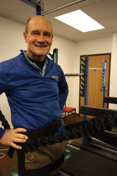For my patient to run without pain, it made theoretical sense to lessen the impact force by supporting his body weight. So, I came up with a solution using a boat winch, a fish scale, a traction harness, and a treadmill. These were the parts that formed the very first version of the LightSpeed Lift.